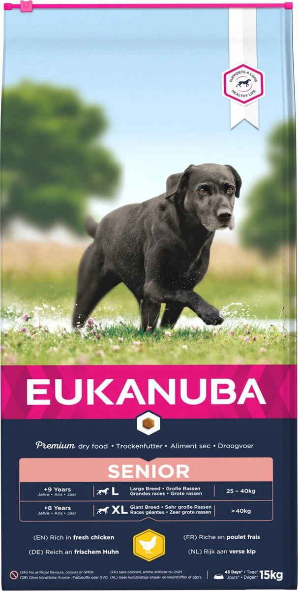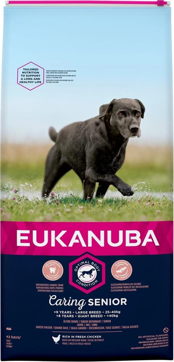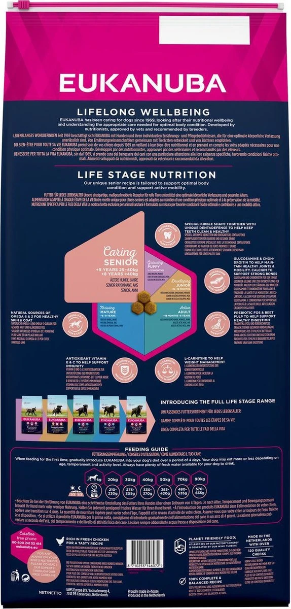 100% complete en uitgebalanceerde voeding. Deze Eukanuba voeding is samengesteld om te voorzien in de speciale voedingsbehoeften van deze oudere honden van grote rassen, ter ondersteuning van een gezond gebit, gezonde gewrichten, gewichtsregulering en een goede spijsvertering. Verschaft de optimale dagelijkse hoeveelheid eiwitten, vetten, koolhydraten, belangrijke vitaminen en mineralen die bijdragen aan een goede gezondheid van je hond. Bevat ingrediënten van hoge kwaliteit en een hoog gehalte aan eiwitten van dierlijke oorsprong.