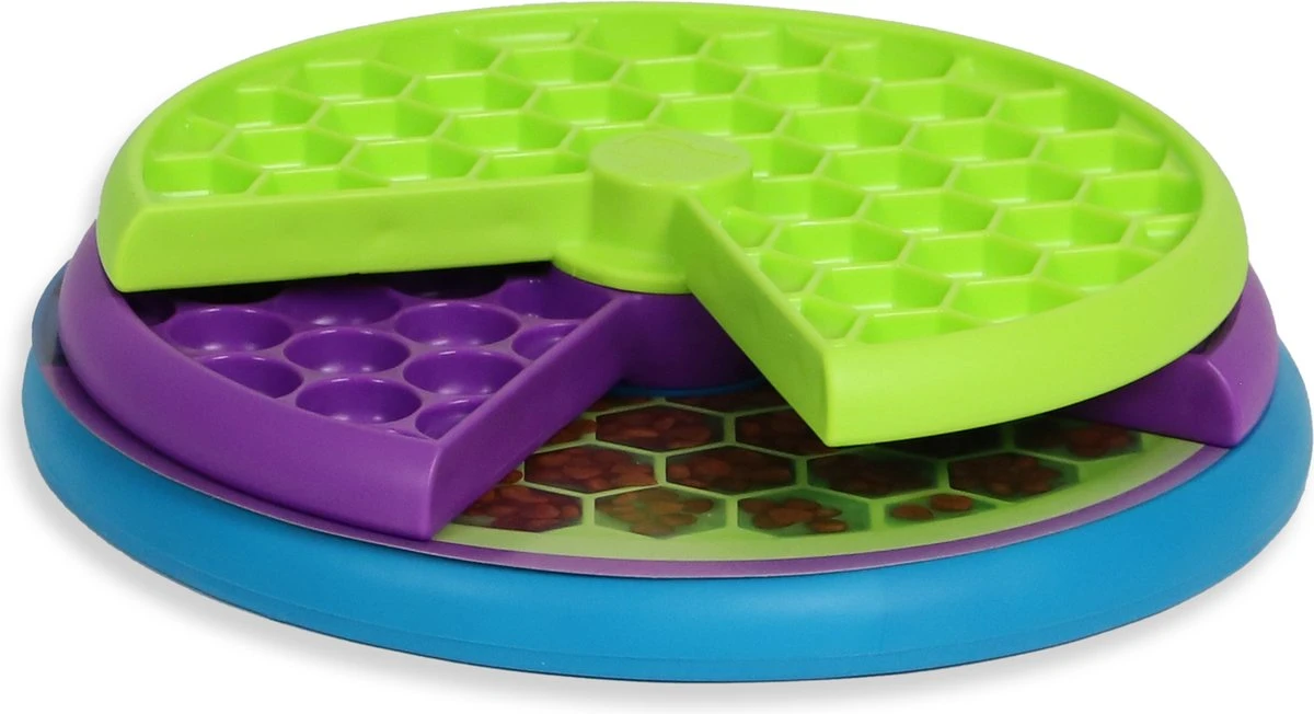 Nina Ottoson Lickin’Layers Likmat 26 cmDe Nina Ottoson Lickin’Layers Likmat 26 cm is een uitdagend intelligentiespel voor de hond, waarbij de hond de schijven moet verplaatsen om bij alle beloningen te komen. Plaats eenvoudig droogvoer, natvoer of snacks in de drie schijven. Jouw hond zal mentaal én lichamelijk uitgedaagd worden om het eten te vinden. De hond moet met de snuit en poten de schijven ronddraaien om zo al het eten te pakken te krijgen. Dit zorgt dat de hond actief moet nadenken over hoe zijn doel te bereiken en hij tevens lichamelijk bezig is. Het spel is schoon te maken door het eenvoudig uit elkaar te halen en de schijven met de hand af te wassen met een milde zeep en water.- Uitdagend hondenspel met schuifjes- De hond moet de schijven draaien om bij alle beloningen te komen- Voor lichamelijke en geestelijke stimulatie- Ideaal tegen vervelingAfmeting: 26 cm