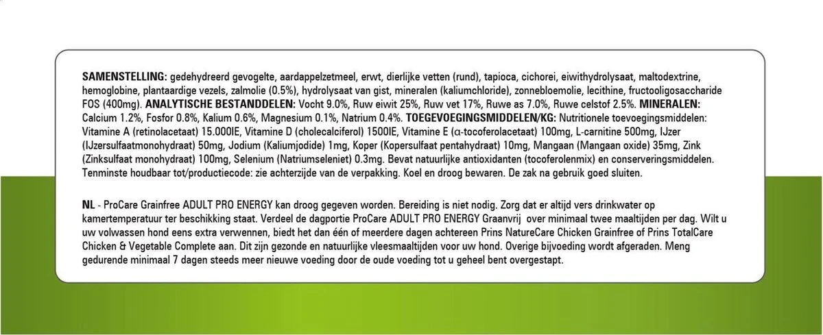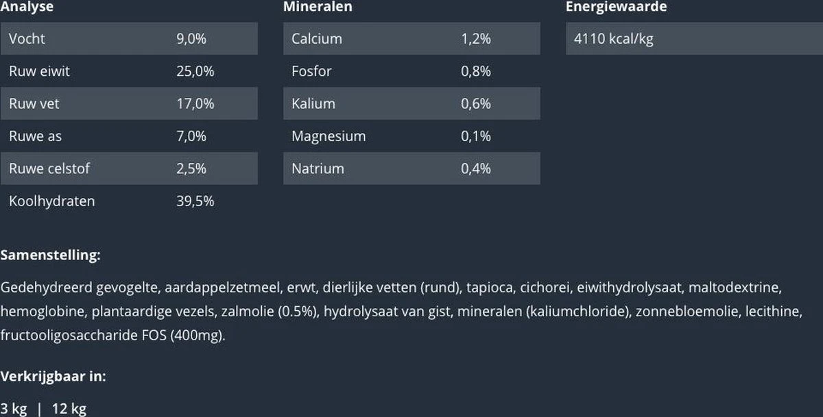 SAMENSTELLING: gedehydreerd gevogelte, aardappelzetmeel, erwt, dierlijke vetten (rund), tapioca, cichorei, eiwithydrolysaat, maltodextrine, hemoglobine, plantaardige vezels, zalmolie (0.5%), hydrolysaat van gist, mineralen (kaliumchloride), zonnebloemolie, lecithine, fructooligosaccharide FOS (400mg).