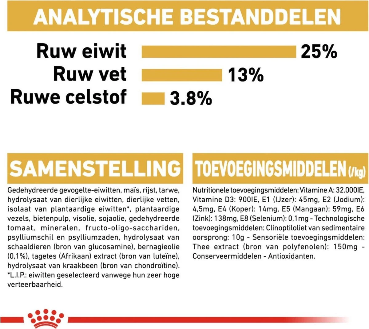 | Analytische bestandsdelen | Analyse: Ruw eiwit: 25.00% – Ruw vet: 13.00% – Ruwe as: 6.10% – Ruwe celstof: 3.70% – Vocht: 9.50% |