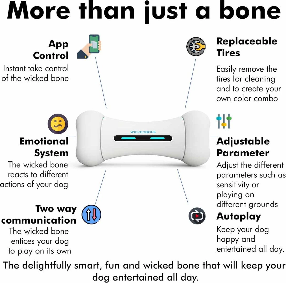 De Wickedbone is het perfecte speelgoed voor een energiek huisdier, die niets liever doet dan spelen. Dit intelligente honden speeltje kan bestuurd worden door middel van een app op je smartphone, maar heeft ook een interactieve stand. Zo kan je de WickedBone zelf besturen en 9 verschillende trucjes laten uitvoeren. Daarnaast biedt de interactieve stand uitkomst voor wanneer je zelf te druk bent om met je huisdier te spelen.